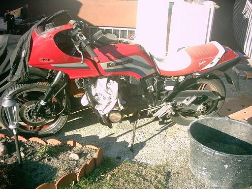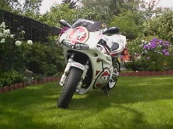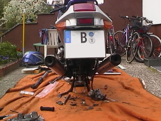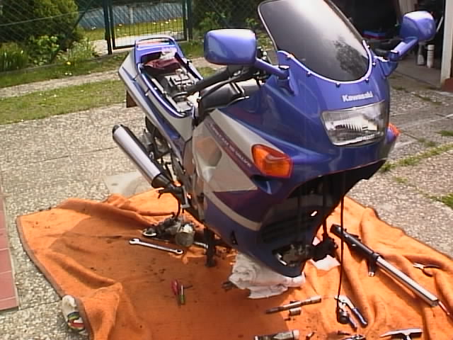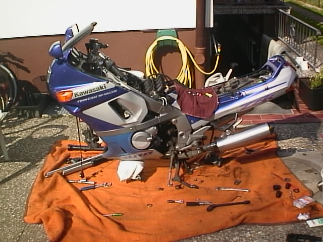 Im Frühjahr 02 hatte Christian so einige Probleme mit seinem Mopped! Einige Verschleissteile waren verschlissen und das Fahrwerk nicht legal! Der Kettensatz war nicht mehr o.k.. Kawasaki hat so eine Menge Euros gefordert, dass man schon überlegen konnte, sich eine andere zu kaufen und der Tüv-Termin war nicht weit!